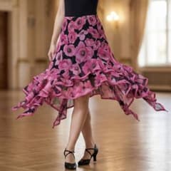 Leirena 社交ダンス スカート 花 ピンク 黒 フリル ラテン レイリーナ