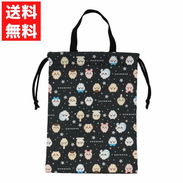 ちいかわ シューズバッグ 総柄縦型巾着 ブラック モモンガ 古本屋 ハチワレ ラッコ 入園 入学 シューズバッグ 通園 通学 うち履き 靴入れ