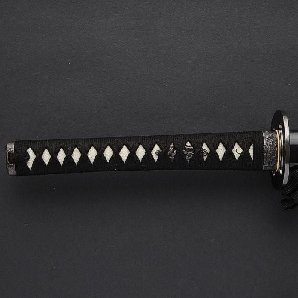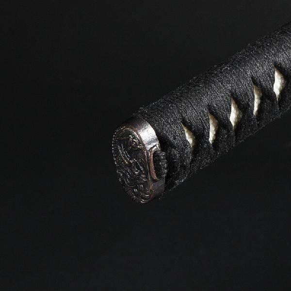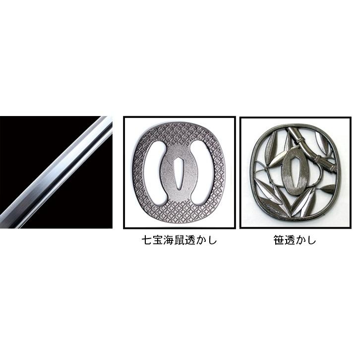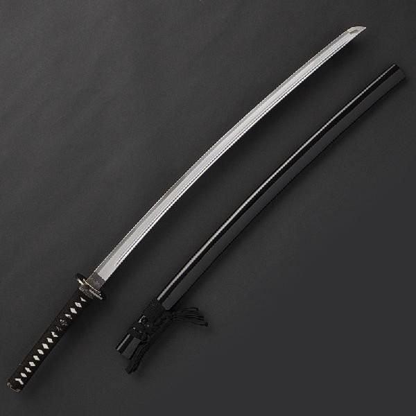 【仕様】刀身:特殊強化合金製 柄糸:純綿 下緒:ポリエステル 鍔:亜鉛ダイキャスト鞘:黒石目または黒呂 重量:(鞘を払って)約790グラム
